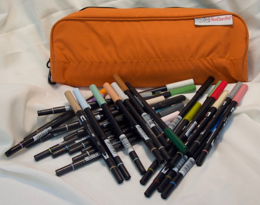 Finally, some years ago I bought a selected set of Tombow ABT felt tip pen/brush combo pens at Amsterdam Art in Berkeley, CA. I chose the ones that, as with the Derwent drawing pencils, would work best for nature subjects and were light in value for the most part. The current carrier and what I had on hand is a Silver Brush Limited Slim Case Media zip pouch. At some point I’ll get a case that about a third shorter.
