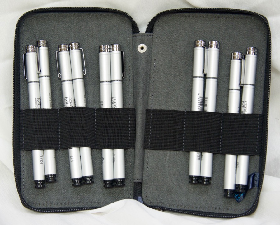 I’ve used Sakura Micron pens for years, but I’m finding that I can’t trust them to hold a consistent line width and quality so I started to research alternatives and am so happy to have found Copic Multiliners, which seem to be the standard these days. I bought the one that’s in my go-to kit to try one out, was quickly hooked and ordered the set, as seen above in a Global Art zip pouch. Not only am I very happy with the quality of the lines they make, the barrels are aluminum, not plastic, they can be refilled and the nibs can be replaced. So they are much more environmentally friendly and there’s no more just throwing a Micron in the trash when it’s empty. Whew.