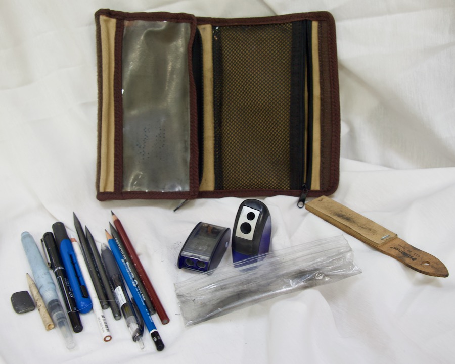 Finally, this is my catch-all pouch, also made by Derwent and purchased at Cass Art Supply in London. The pencil sharpeners go into the zip loc bag in front of them. Otherwise, it’s just extras of what’s in the other pouches, including a second retractable No. 11 Exacto knife. I make sure both are in my checked bag if I’m flying somewhere.