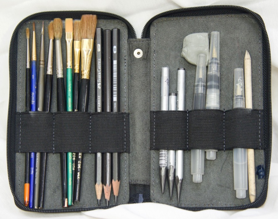 This is my “grab and go” kit. It and a 7×5″ sketchbook will fit in my purse.