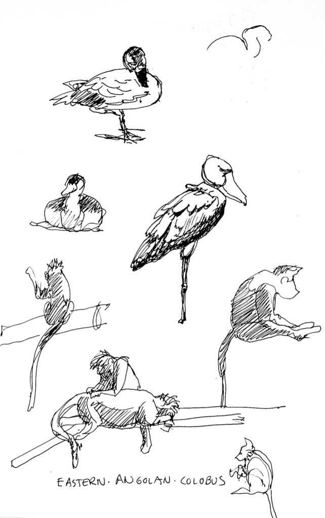 Here’s a page of very fast sketches I did some years ago. The birds stayed in position, but I had less than a minute for the monkeys. In my tutorials you’ll learn how to make choices of what to sketch, how to see the important shapes and how to simplify, along with information on the various pens, pencils and brushes you have to choose from.