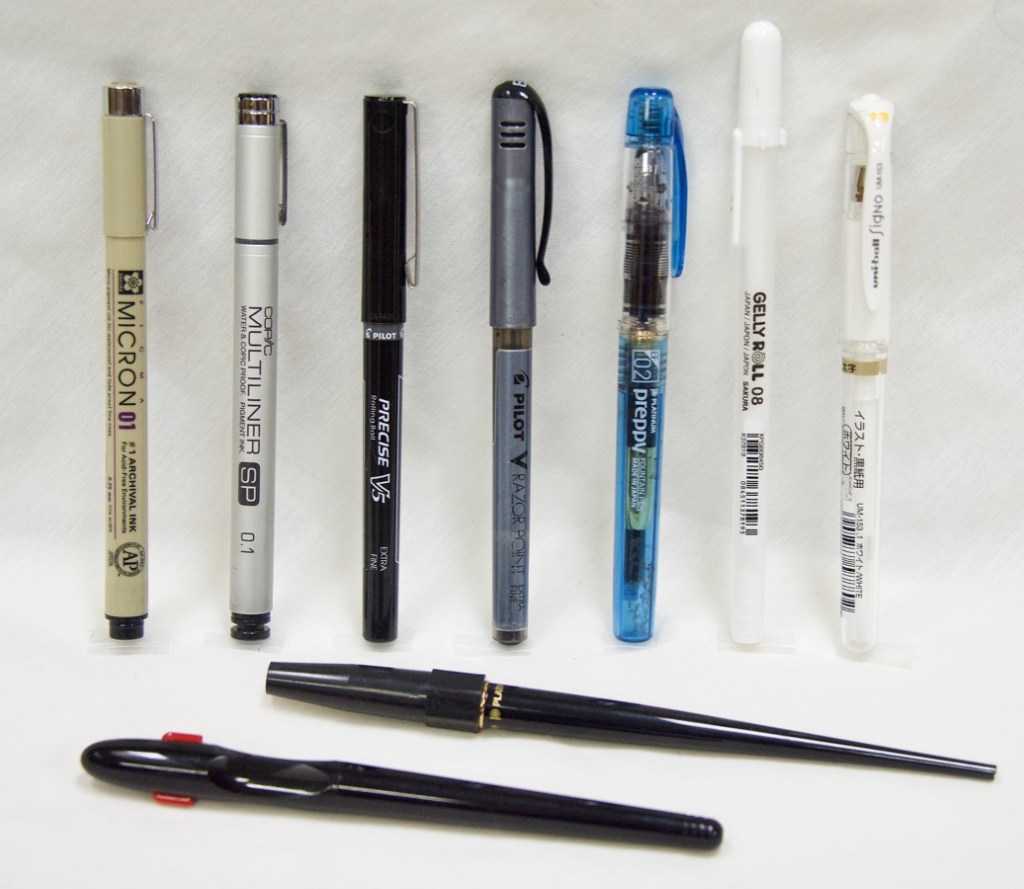 Top photo of pens: From left to right: Sakura Micron, Copic Multiliner SP, Pilot Precise V5 EF, Pilot V Razor Point EF, Platinum Preppy fountain pen, Sakura Gelly Roll, Mitsubishi uni-ball Signo; below from front to back: Pilot Extra Fine fountain pen, Platinum Carbon Desk Fountain Pen, EF Nib