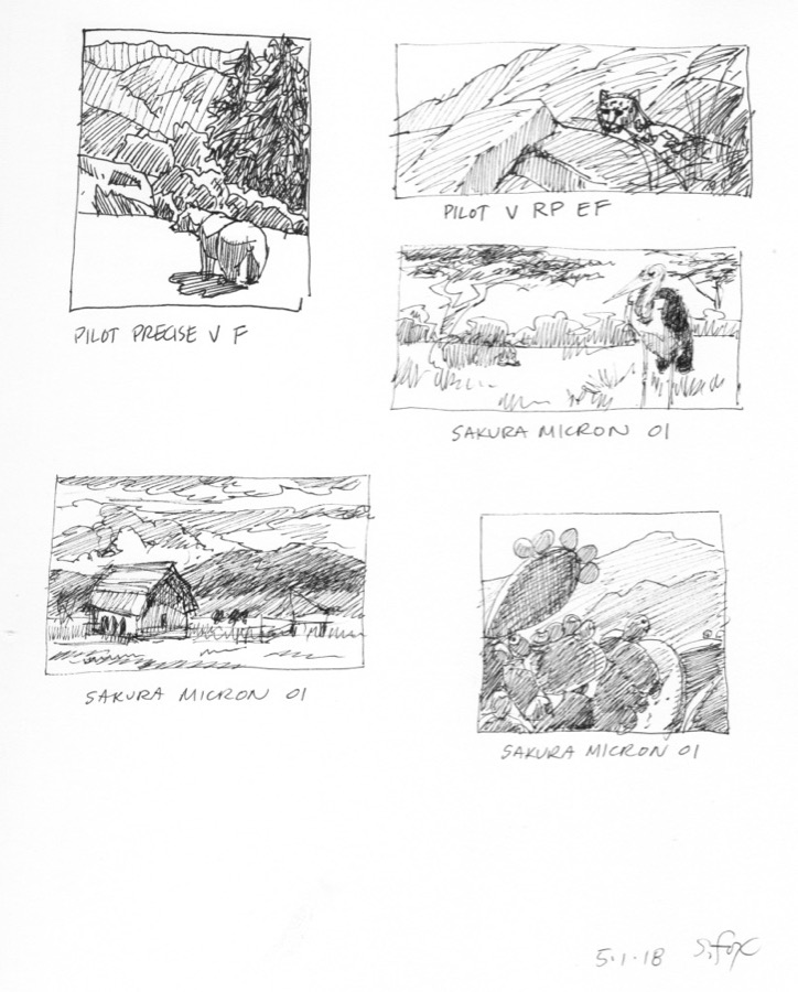 Top photo of pens: From left to right: Sakura Micron, Copic Multiliner SP, Pilot Precise V5 EF, Pilot V Razor Point EF, Platinum Preppy fountain pen, Sakura Gelly Roll, Mitsubishi uni-ball Signo; below from front to back: Pilot Extra Fine fountain pen, Platinum Carbon Desk Fountain Pen, EF Nib