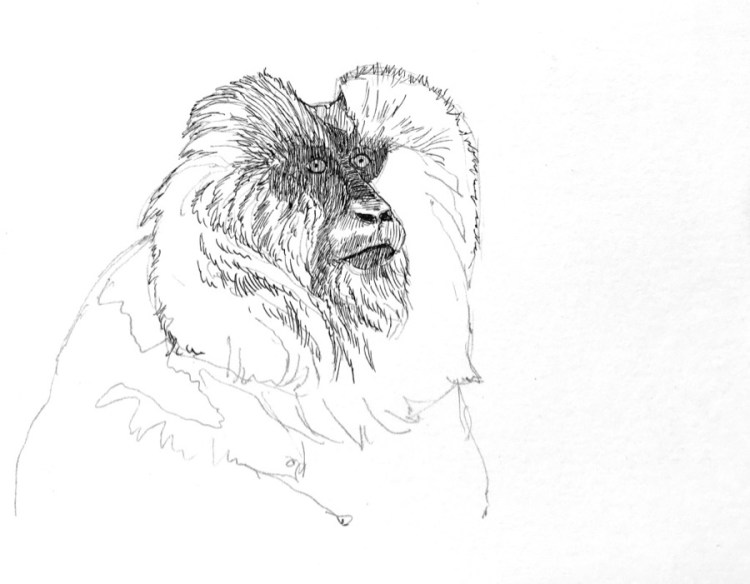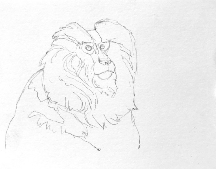 I used my own photo reference of a lion-tailed macaque, an endangered species that I saw in an accredited zoo, beginning with a pencil drawing, laying down shapes and getting the features correct. No fussing about “detail”.