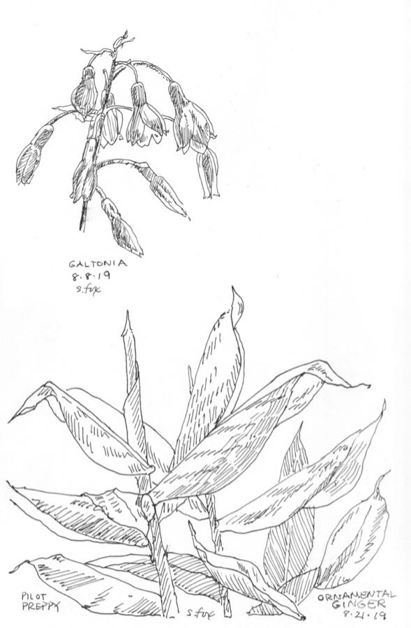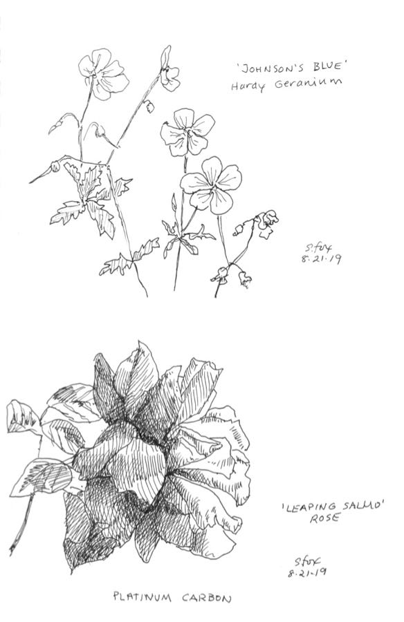 It’s been quite warm this August for Humboldt County, so nice weather to sit outside and sketch. Above: “Silk Road Lilies” Kakuno fountain pen with Prismacolor pencils. I drew them directly with the pen, no pencil underdrawing in a Stillman and Birn Zeta sketchbook.