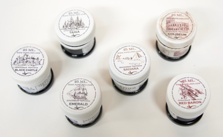 There are six different inks. They can be purchased separately or as a set, as I did. The full set is $9.99 plus shipping from Moscow, free with a purchase of $35 or more which, if you like trying out pen nibs, isn’t hard to ring up. The seller, Alexandre Popel (Bukvawood is the name of his Etsy shop) describes them as “…water-based walnut ink. Consistency, as in standard nut ink, which is obtained by diluting the crystals in distilled water.”