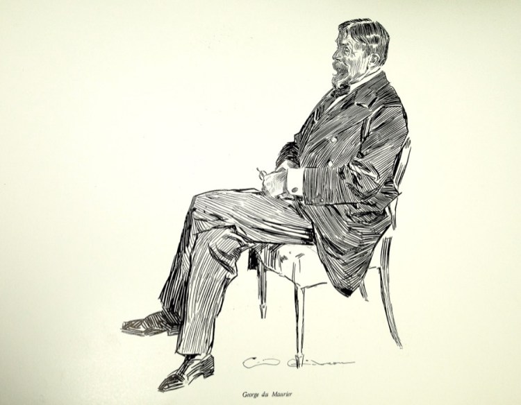 Gibson also did portraits of his fellow artists, in this case George du Maurier, who is best know for writing and illustrating “Trilby”, the story of a young girl who becomes an artist’s model. This was clearly done from life and also very quickly. Gibson either used two or more nibs or one very flexible one, I suspect the latter, to lay in the dark coat and the lighter pants. What to me is really gutsy is how he effortlessly handles du Maurier’s face with simple, mostly vertical strokes and also varies the line weight of the hair with quick also vertical strokes.