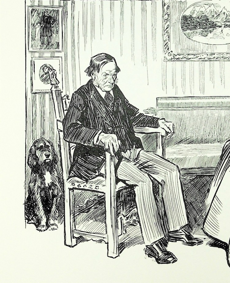 One of the things we were taught when I was studying illustration was to be specific, not generic. This is a real dog who belongs to someone and is drawn from life, at least for preliminary sketches. And he makes two appearances in Mr. Pip’s story. Notice how the front legs are in a different position in each drawing and how, through the use of value, the dog is fully in the first picture and part of the background in the second. He looks to be some kind of spaniel or spaniel mix with those long ears. Maybe he was the canine companion of one of Gibson’s artist friends.