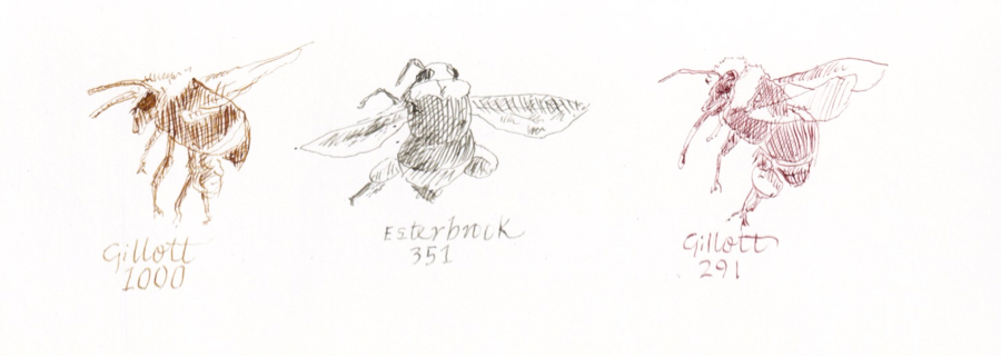 Here’s a comparison of my smallest nibs compared to the Esterbrook Falcon 048, the most popular nib the company ever made, to the point, so to speak, that every company had to have at least one nib in the “falcon” shape in its product line. From left to right from the Falcon is a Gillott 290, Gillott 291, Gillott 1000 and then a Hunt 100 and an Esterbrook 351. They all require respect and a light touch. A pen and ink artist of the past characterized one of them as having a “short but happy life”. They are all quite flexible and despite being made of excellent Sheffield steel the pressure needed to vary line width eventually causes metal fatigue, the tip doesn’t close together and at that point they’re done.