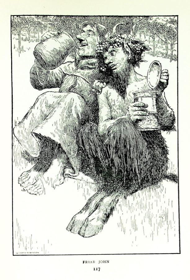 Sometimes he went for far more detail and texture. There’s a lot of variety in the drawings in these two volumes, everything from a simple vignetted head to fully realized scenes. He used short straight strokes for the friar’s robe and long, sweeping strokes for the upper legs of the satyr. The forest in the background makes the friar’s head “pop”. The grass is indicated by relatively few straight lines of different lengths. He used short straight lines to model the jug even though the jug is clearly curved.