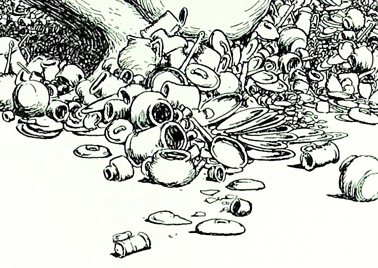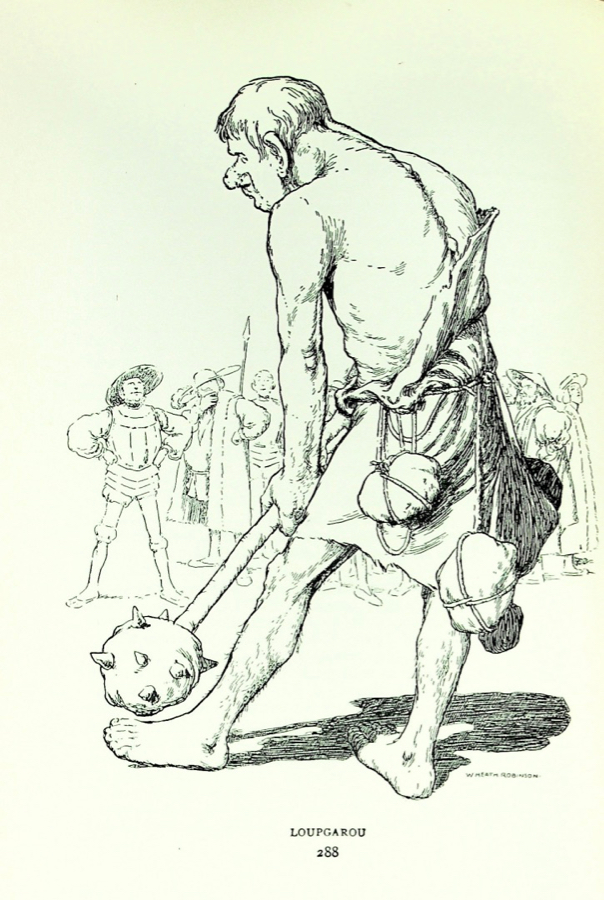 Here he uses essentially two line values to create a foreground and background. Notice also how simply he models the body of the giant, yet the muscle definition is quite clear. In pen and ink every line counts and Robinson clearly had a great command of anatomy.